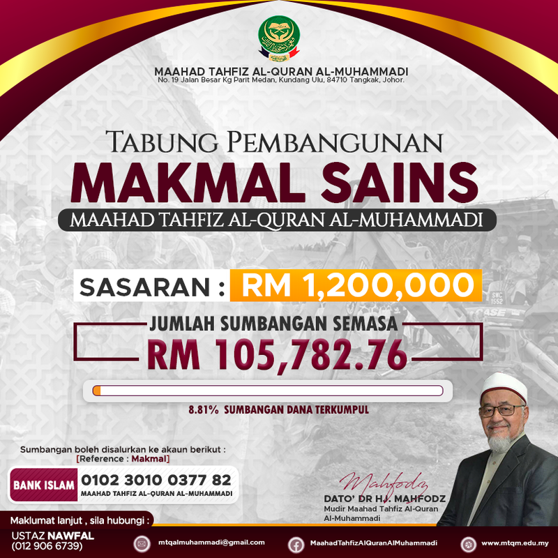 Dengan misi “Maahad Tahfiz Sains 2024”, Maahad Tahfiz Al-Quran Al-Muhammadi sedang berusaha membina bangunan baru yang bakal menempatkan Makmal Sains dan Makmal Komputer.